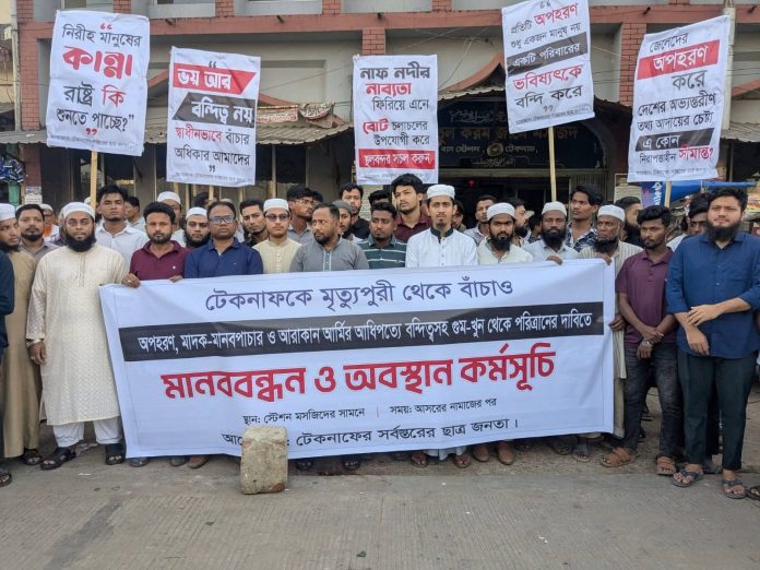 কক্সবাজারের টেকনাফে সাম্প্রতিক সময়ে অপহরণ, মানবপাচার, মাদক ও সীমান্তঘেঁষা সহিংসতা বৃদ্ধির অভিযোগে মানববন্ধন ও অবস্থান কর্মসূচি পালন করেছে স্থানীয় ছাত্র-জনতা। সোমবার বিকেলে বাস স্টেশন জামে মসজিদের সামনে আয়োজিত এ কর্মসূচিতে বিভিন্ন শ্রেণি-পেশার মানুষ অংশ নেন।