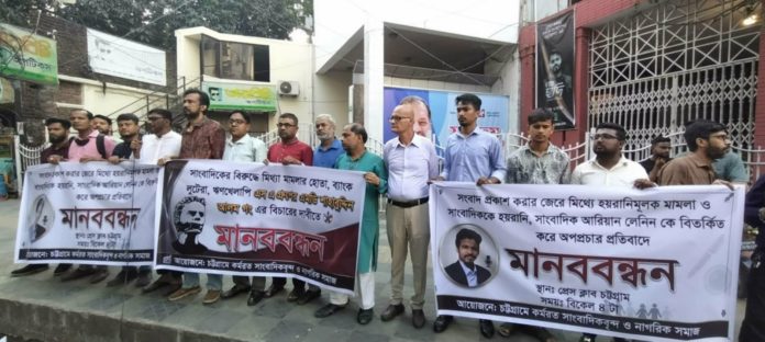 মোঃ রিয়াজ উদ্দিন, চট্টগ্রাম, সাংবাদিক আরিয়ান লেলিনের বিরুদ্ধে মিথ্যা মামলার প্রতিবাদে চট্টগ্রামে কর্মরত সাংবাদিকদের মানববন্ধন প্রতিবাদ সমাবেশ অনুষ্ঠিত।
